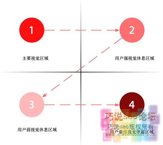 上图,便是通过一些用户的浏览的访问得出的吸引用户眼球的分布图。从上图可以看出左上角是用户进入你网站浏览的第一个时间点,也是认知你网页的开始。所以,若要想提升用户体验度,那么就必须减少左上角的跳出率,制作出比较吸引用户的眼球。